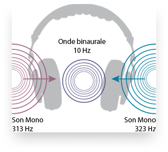 Découverts en 1839 par le physicien Heinrich Wilhelm Dove, puis popularisés par Gerald Oster en 1973, les sons binauraux reposent sur un principe simple : lorsque deux fréquences légèrement différentes sont envoyées dans chaque oreille (par exemple 313 Hz à gauche et 323 Hz à droite), le cerveau perçoit un troisième son — une pulsation rythmique correspondant à la différence entre les deux (ici, 10 Hz).